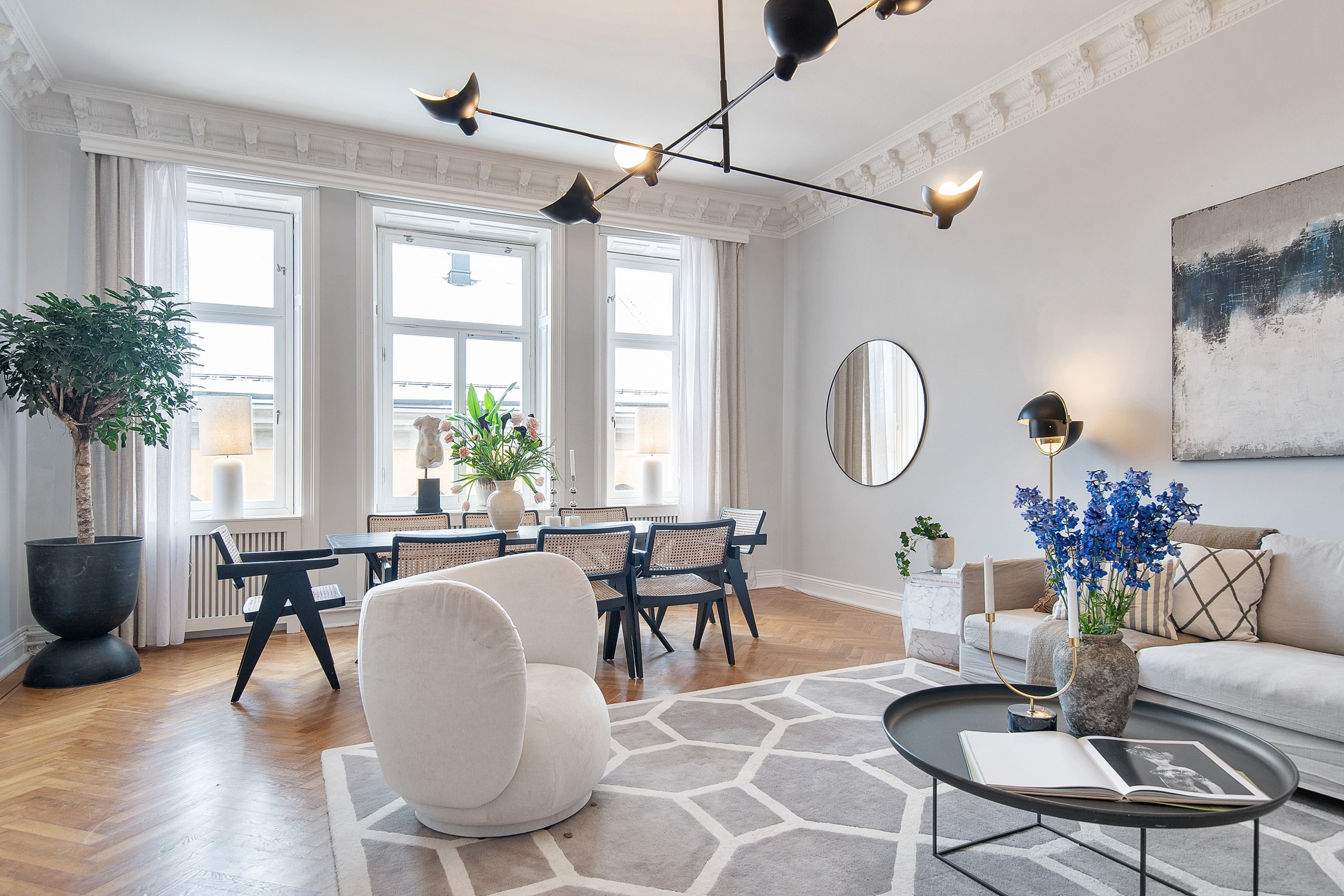 Underbart och ljust lättmöblerat vardagsrum med plats även för stor matsalsmöbel. Takhöjd om ca 3,3 m och magnifikt bevarade originaldetaljer så som fiskbensparkett, tre stora fönster med fina nischer vilket ger ett fint ljusinsläpp. Stuckatur, takrosetter, elementskydd m.m.