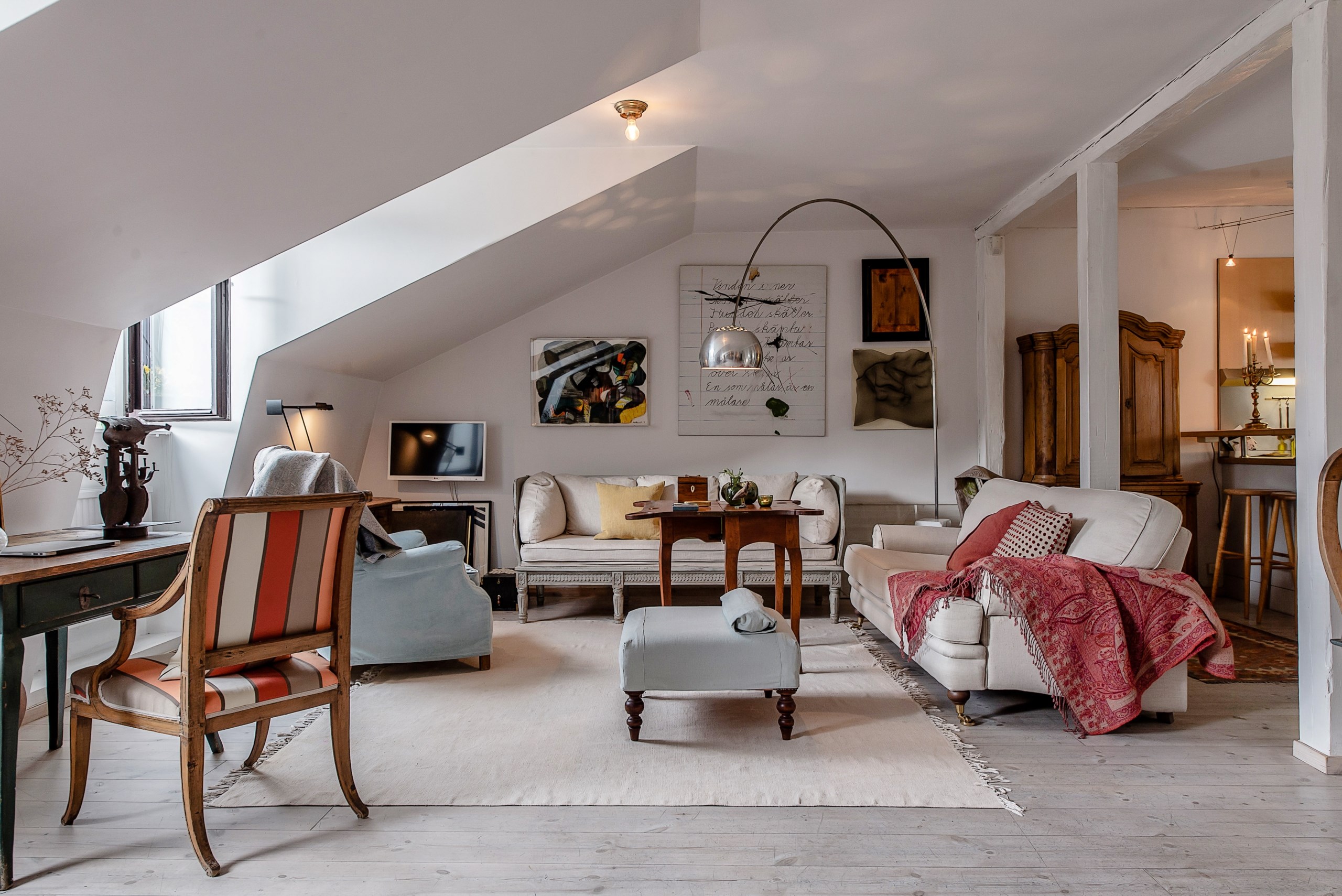 Ljus och fin vindsvåning med genomgående vackert brädgolv, våningen disponeras idag som två rum och kök men kan enkelt återställas till 3 rum och kök