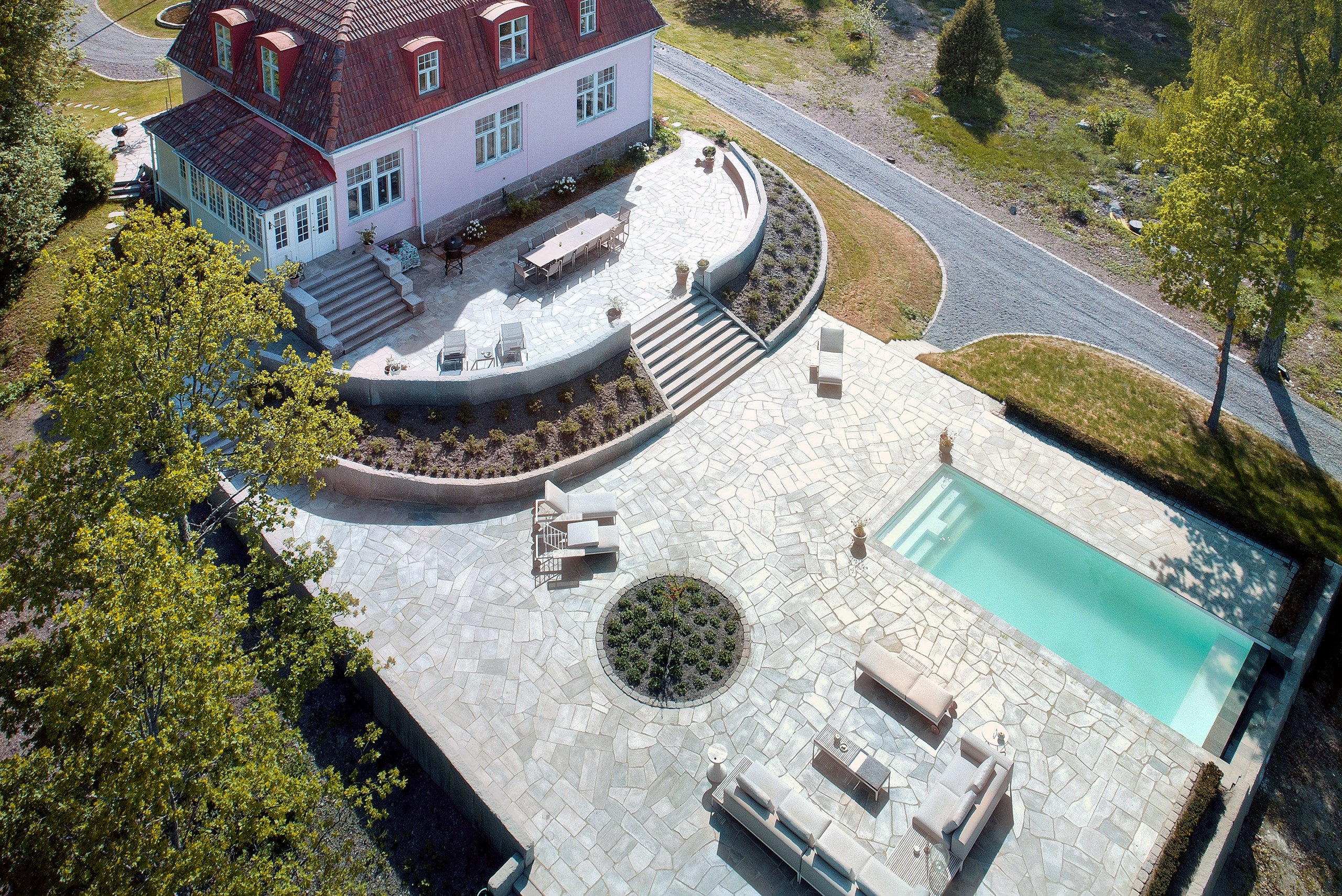 | Vacker strandtomt vid Mälaren om 20 676 kvm. Sandstrand med egen brygga från 2015 med två flytbryggor för vattenskoter. Sluttande björkallé som leder upp till grusad gårdsplan, inramad med kantsten, vändplan med centralt placerad flaggstång och fontän. Skifferbelagd uteplats mellan köksentrén samt den representativa huvudentrén. Runt huset finns rabatter med rosor, lavendel, rhododendron mm. På tomten finns flera fruktträd, hallonbuskar mm. Stora skifferbelagda uteplatser i etage med sagolik utsikt mot vattnet. Specialbyggd infinitypool i polystone från Niveko. Poolen, om c:a 3x8m har tillhörande värmepump, buffertank, inbyggd belysning samt motordriven poolguard. Trappor i full bredd på ena kortsidan, overflow i den andra. Gjuten grund innehållande poolmaskinrummet. Bygglov finns för poolhus om 25 kvm. Lekplats med ny gungställning och nedgrävd studsmatta (med uppsikt från huset). Bakom gästhuset finns en mindre fotbollsplan. Garagebyggnad om c:a 100 kvm med två garage, varav det ena isolerat och två carports. |