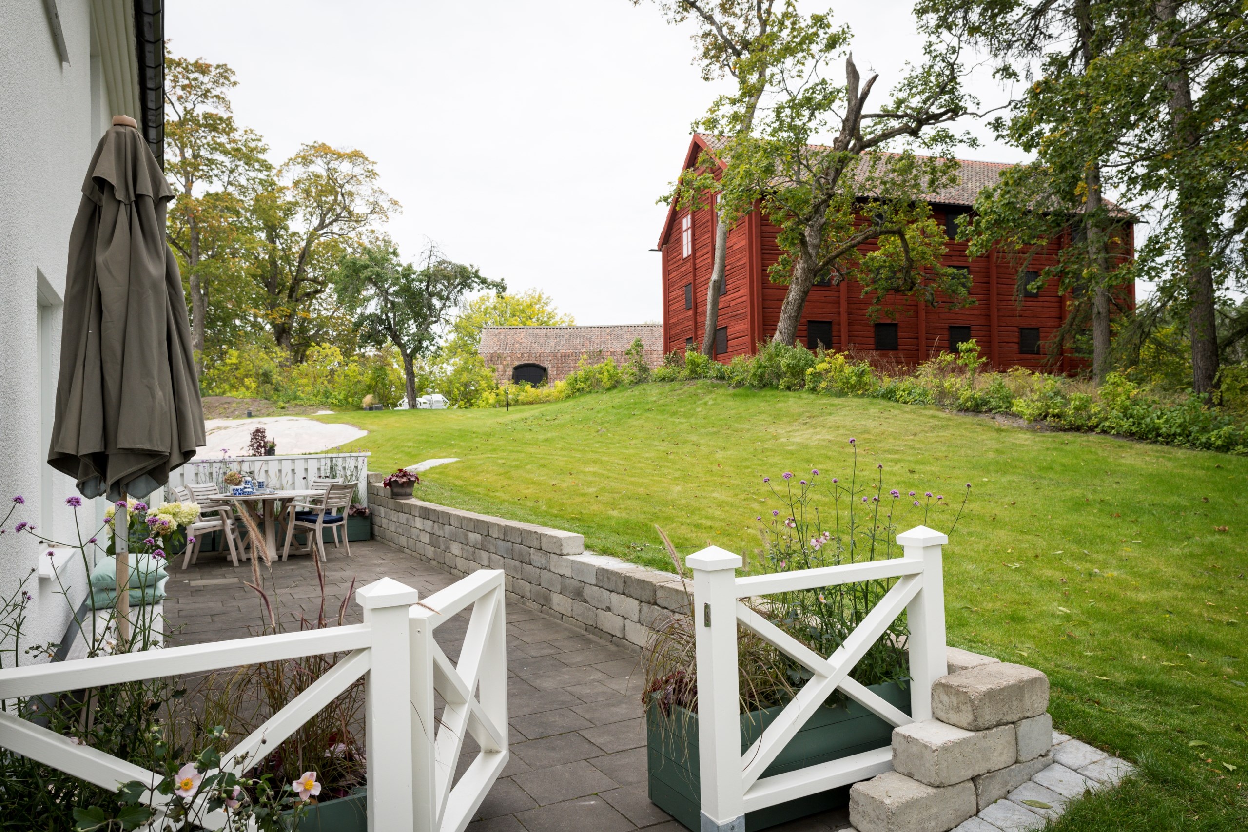 Stor grönskande uteplats där solen sipprar in från lunch fram till solnedgång.