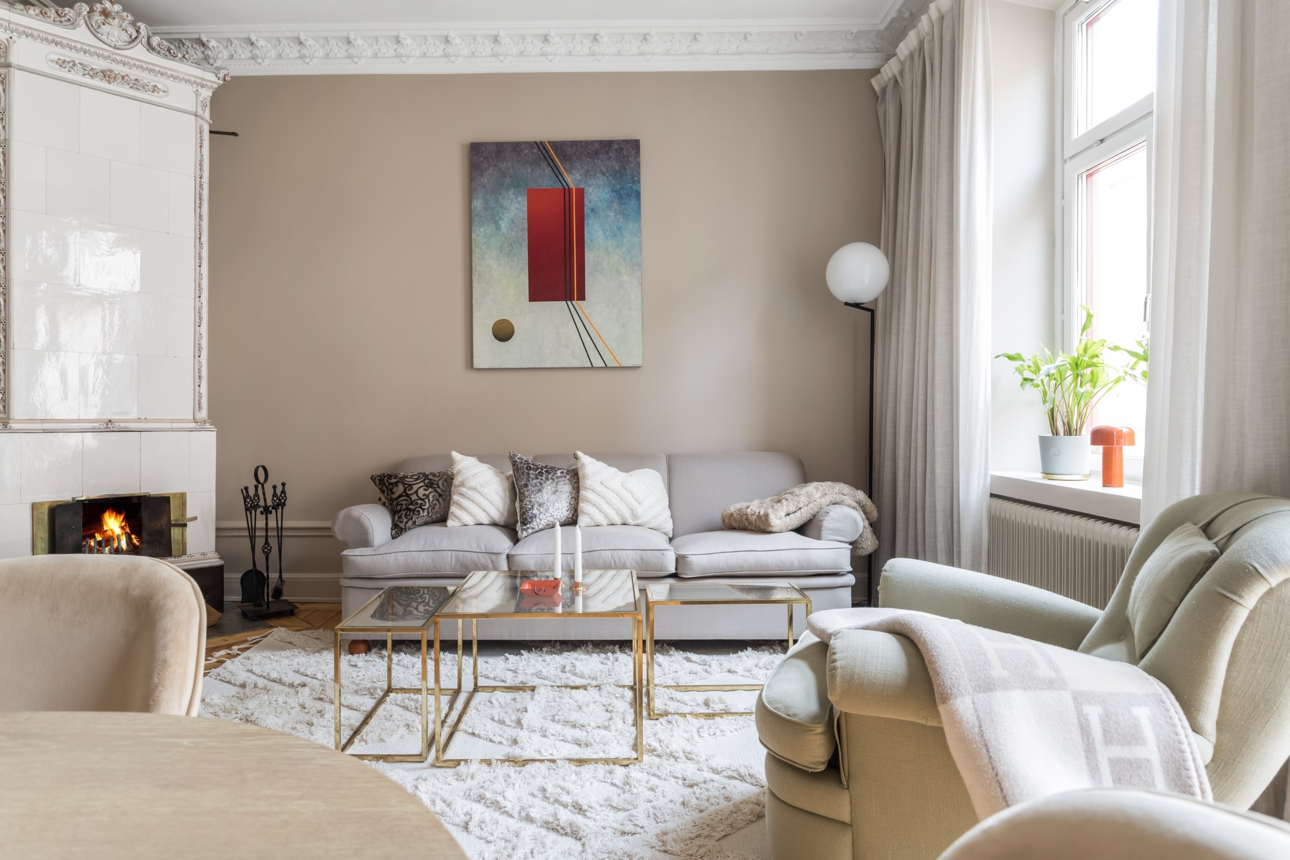 Välkomnade entréhall med riklig platsbyggd förvaring och höga bröstpaneler. Hallen flankeras av lägenhetens samtliga rum. Stort sällskapsrum med stilig kakelugn och utgång till stor balkong i västerläge. Kök med beigea snickerier och bänkskiva/stänkskydd i Carraramarmor. Samtlig maskinell utrustning från Siemens. Tvättmaskin i underskåp från Electrolux.