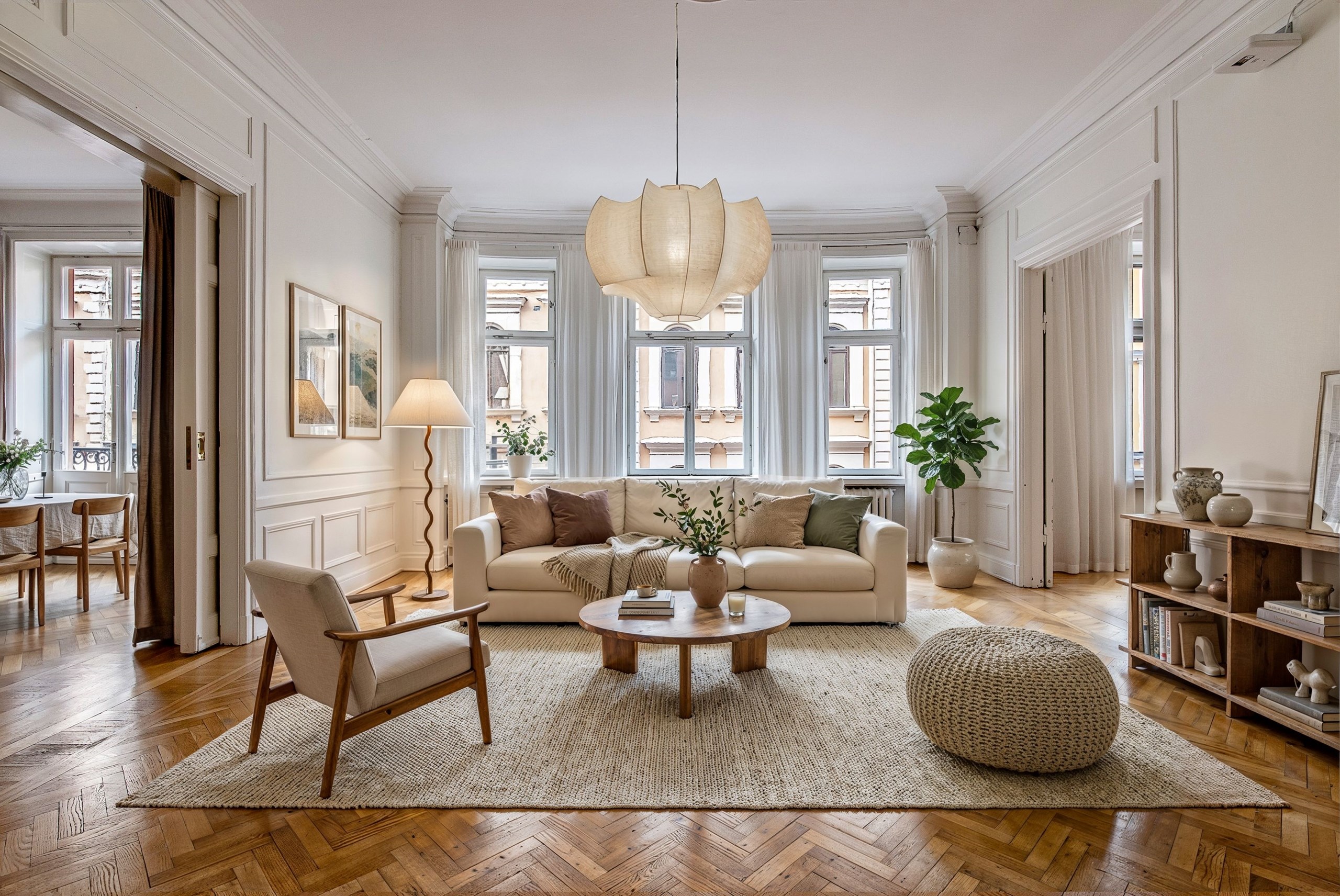 Generös rymd - Ljusinsläpp från fönsterparti med utgång till balkong i västerläge - Stuckatur och takrosett - Bröstpanel - Vackra skjutdörrar mot rum 2 - Vackert fiskbensparkett